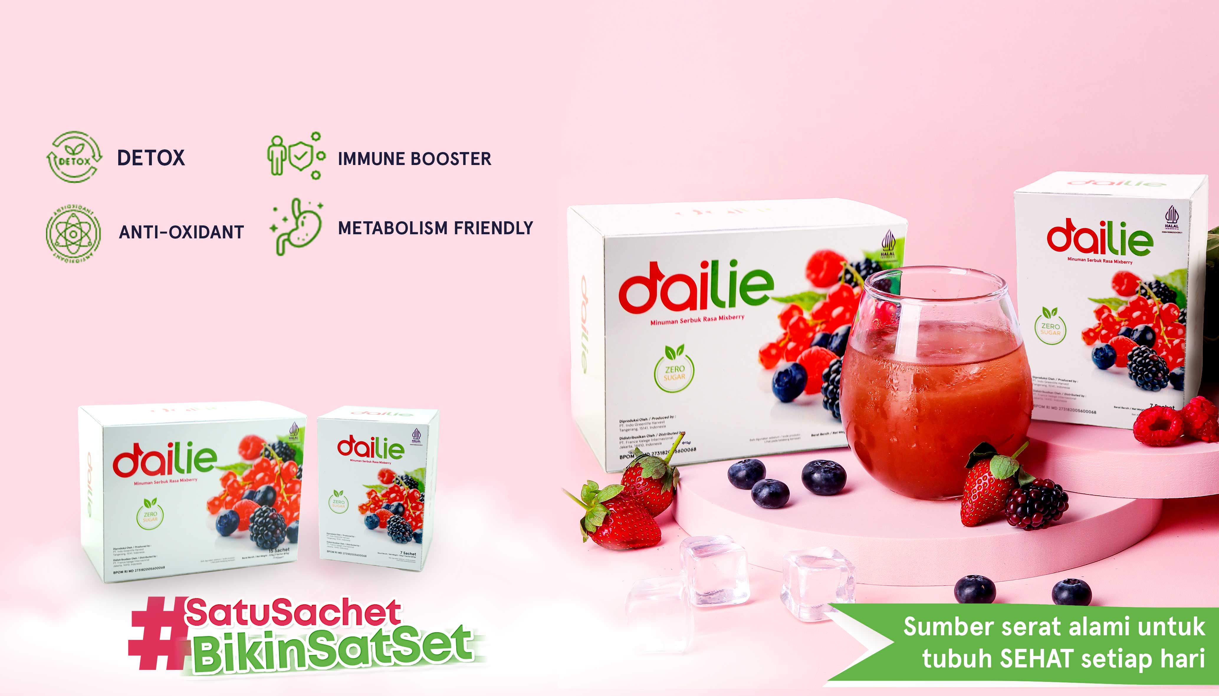 Dailie 3 in 1 – Detox, Antioxidant and Immune Booster Fiber. Mengandung psyllium husk, extract mix berry, inulin, red beet, ascorbic acid, guarana, spinach powder serta mix fruit and vegetable.